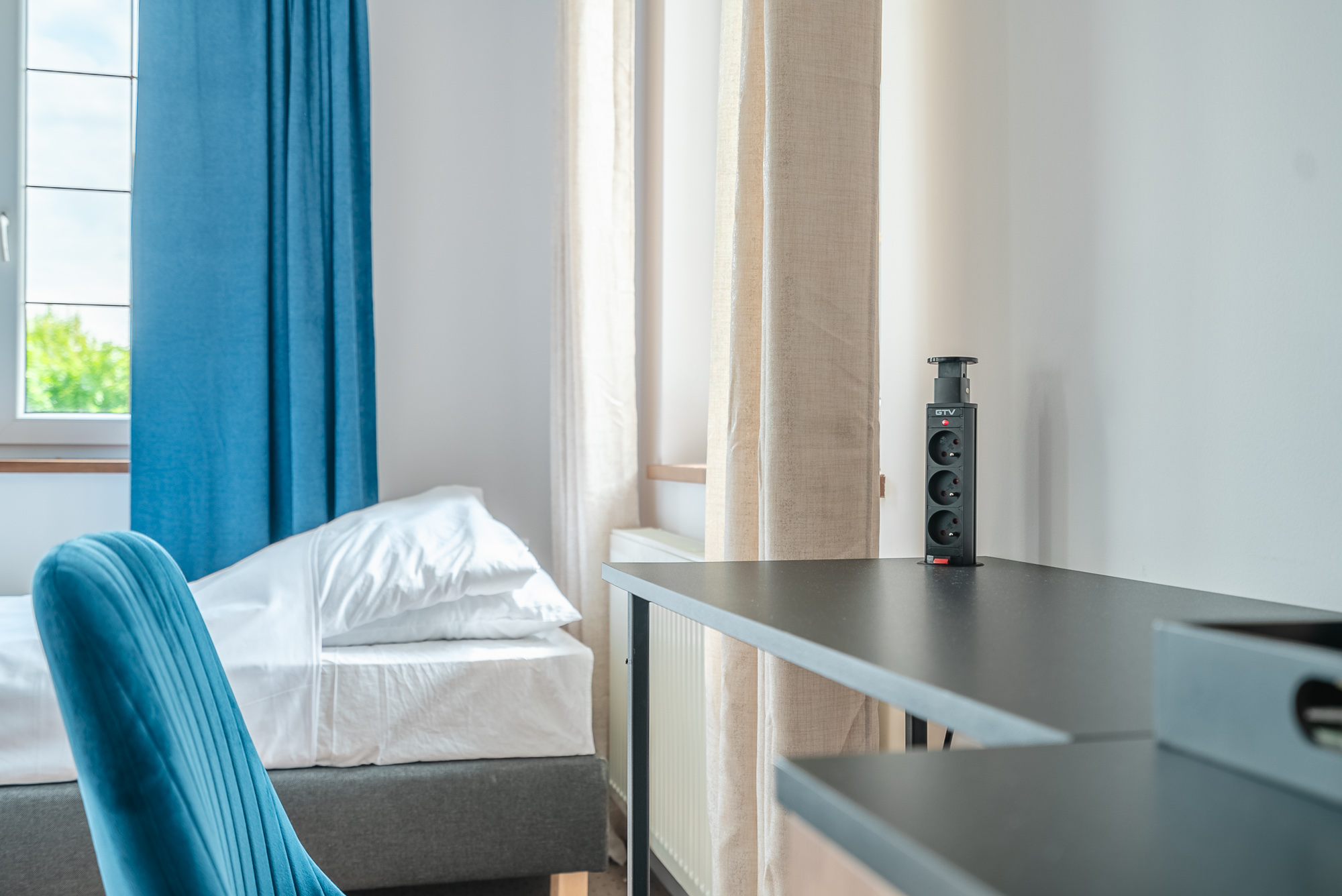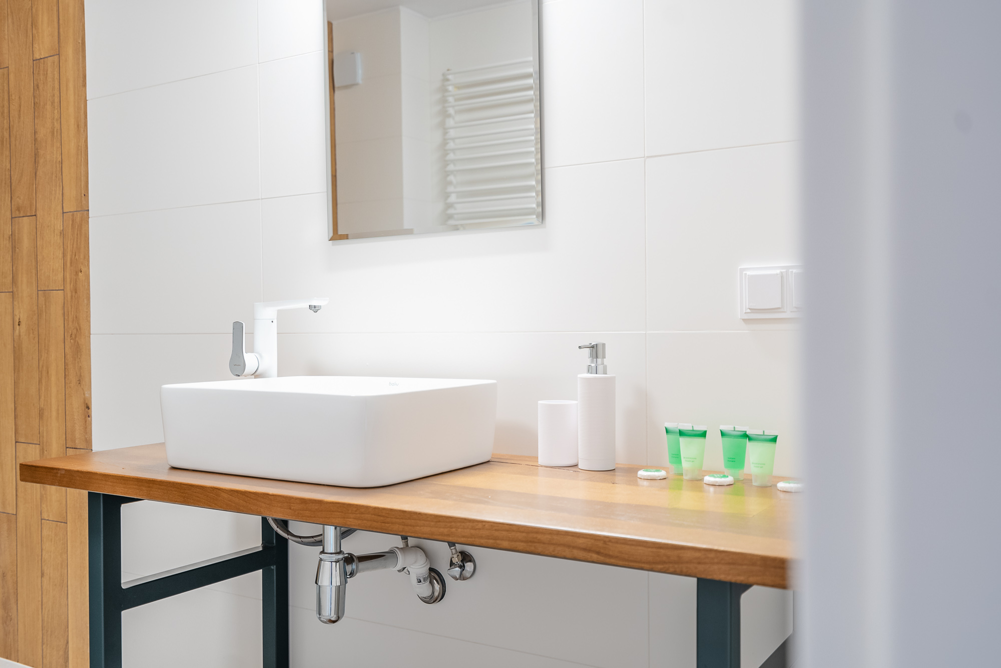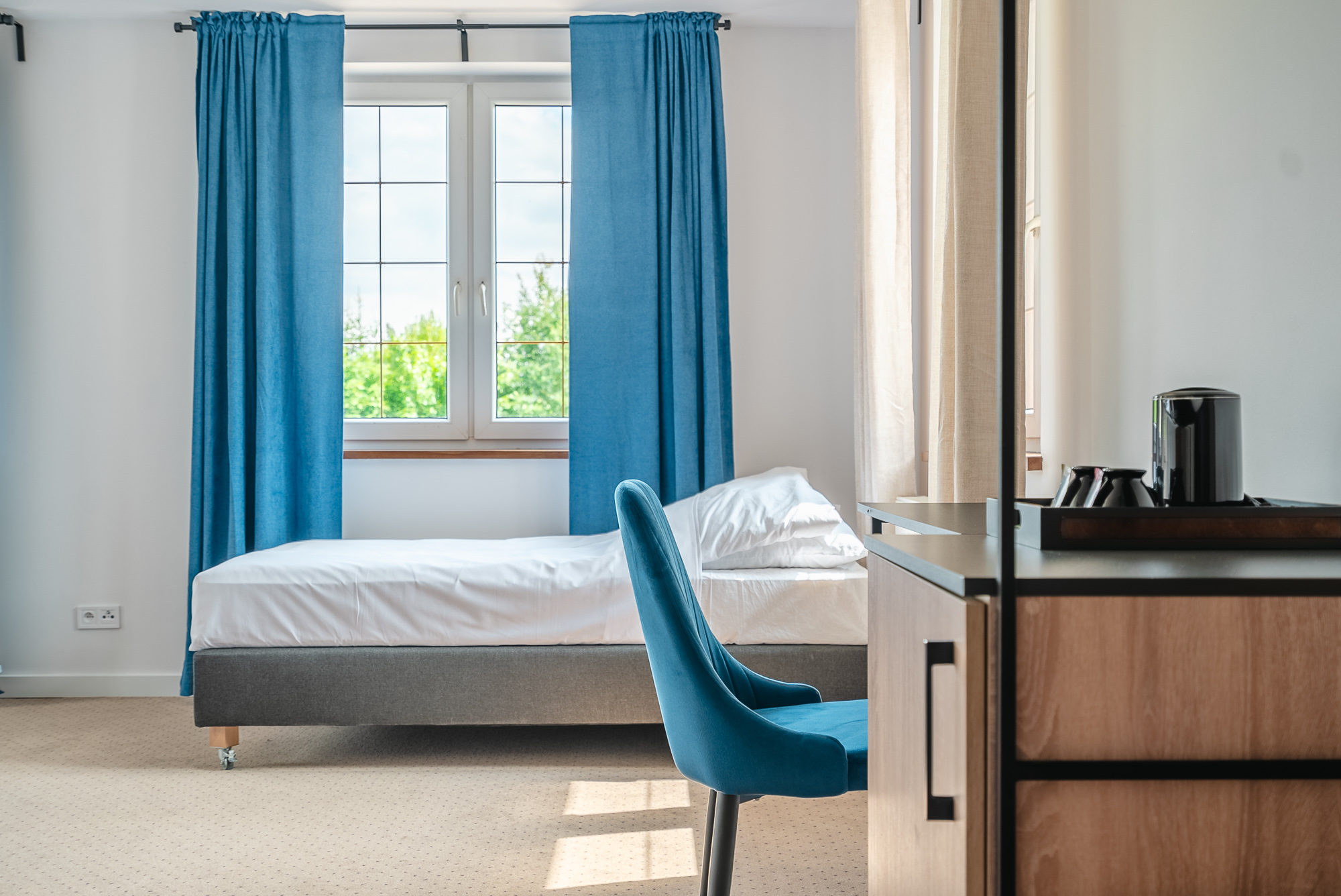 Pokój dwuosobowy ma wymiary 14-20m2, dodatkowo każdy pokój ma swoją łazienkę o powierzchni 3-5m2. Dostęp do pokoi możliwy jest schodami lub windą.