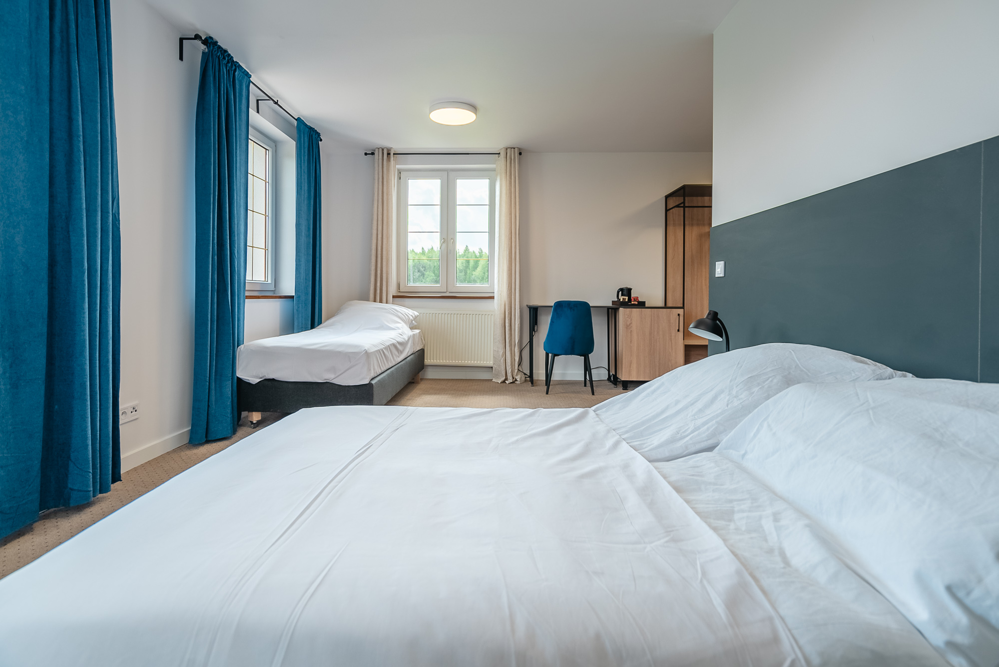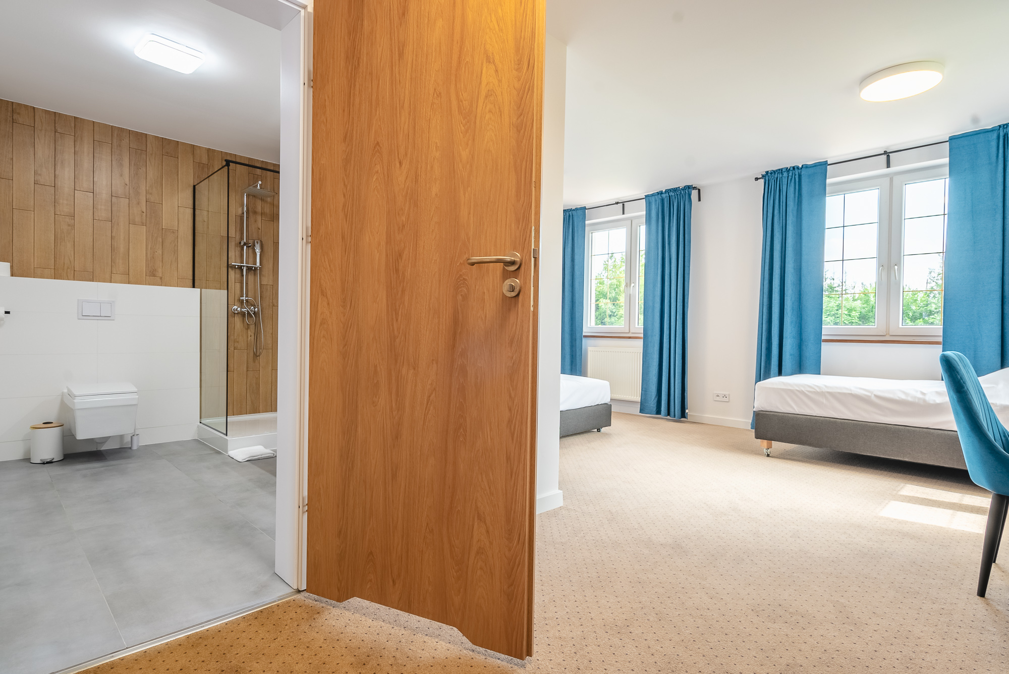 Pokój trzyosobowy ma wymiary 20-35m2, dodatkowo każdy pokój ma swoją łazienkę o powierzchni 4-7m2. Dostęp do pokoi możliwy jest schodami lub windą.