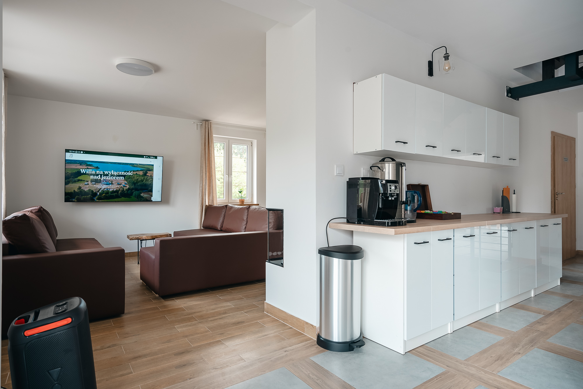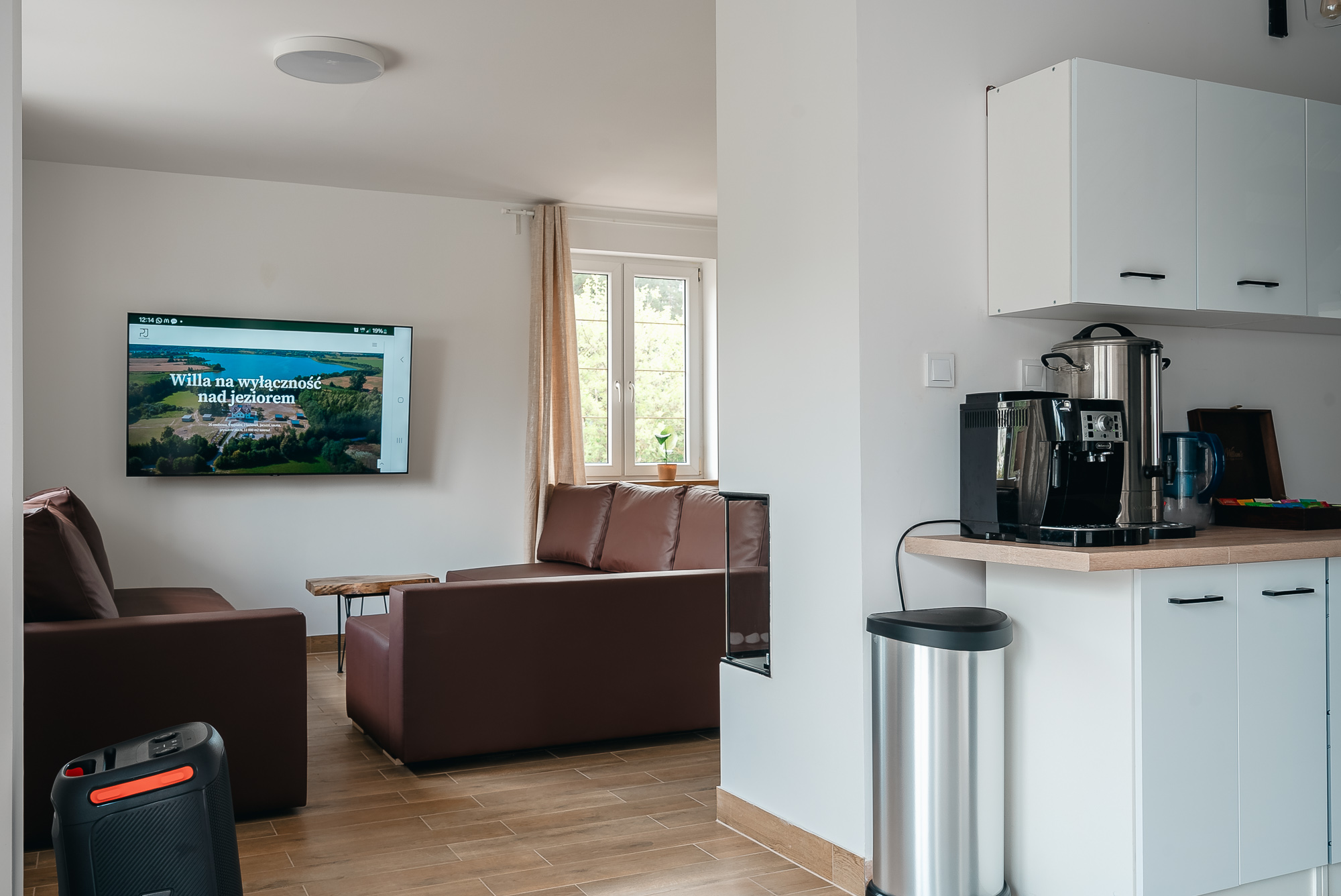 Nie można również pominąć 65-calowego telewizora z funkcją Smart TV, który pozwala na korzystanie z różnorodnych treści online oraz dostęp do popularnych platform streamingowych. Z salonu roztacza się przepiękny widok na malownicze jezioro, co dodaje uroku i relaksującej atmosfery.